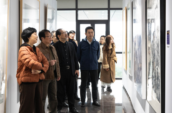 图为邓长青一行来校参观指导“赋能支点——湖北绿水青山优秀美术作品展” 摄影:芮雨欣