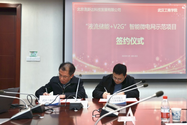 新闻中心讯(记者 吴黄诗慧 芮雨欣)12月24日,武汉工商学院与北京洛斯达科技发展有限公司举行“液流储能+V2G”智能微电网示范项目合作签约仪式。双方将聚焦合作项目,围绕技术研发、场景应用与人才培养开展深入合作,探索校企产学研深度融合服务国家“双碳”战略的新路径。